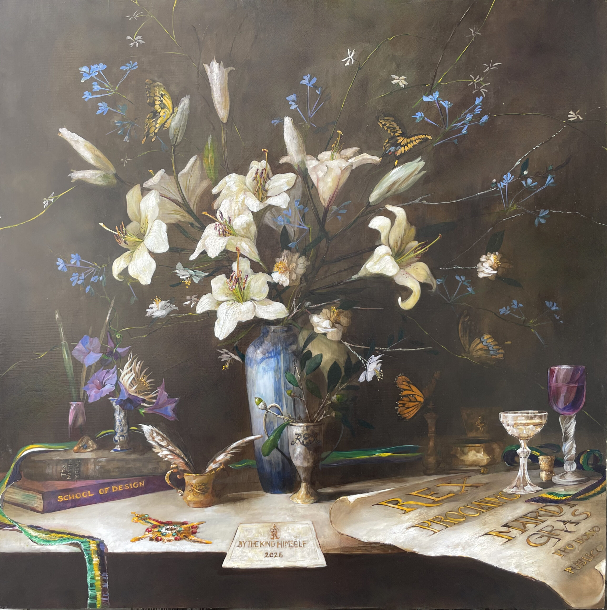 “The Rex 2026 Proclamation is an original painting by New Orleans artist Saskia Ozols. She