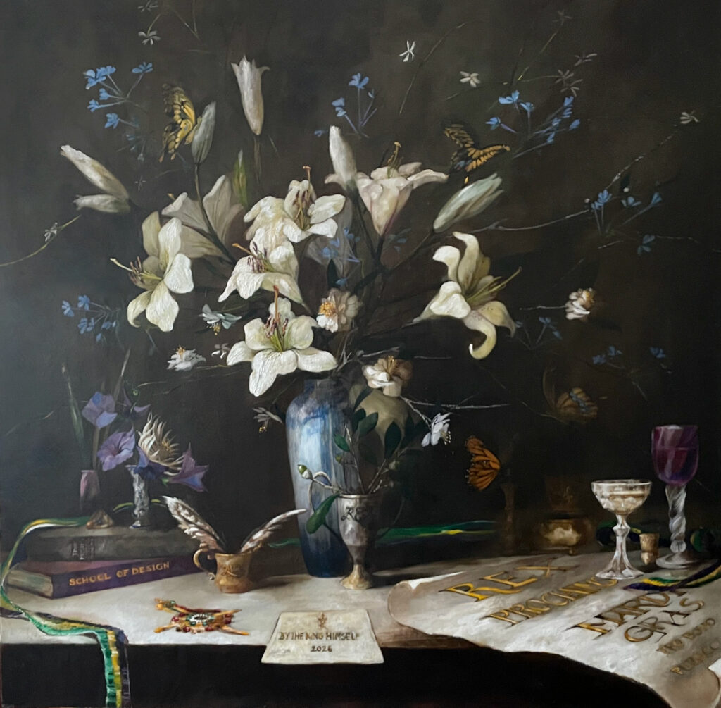 This series of paintings celebrate the local flora of New Orleans and the Gulf South. Small gems of color, these compositions present blooms of the southern garden with generations of vessels and objects collected around the world. The intersection of atmosphere with an object and how we perceive the accompanying relationships of value, color and form allow endless contemplation. The simple beauty that surrounds us exists anywhere we look if we open our senses; in flowers, colors of the air, the light or darkness of the sky. As we allow the experience of inspiration we enter a unique intersection between art and reality. These intersections are abstract, infinite, and come alive through a dialogue of differences.